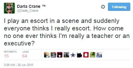 But we at Pornstars4Escort.com, make use of all of our resources to extract the most up to date and the most authentic news for our fans. On her official Twitter profile, Darla clearly states that she doesn’t provide escort services, which is as good a source as it gets when it comes to know if she provides or not. It surely is a loss to everyone to know that she doesn’t provide, but we have to accept it and move on. She also made a sarcastic comment on the topic as you can see on the screen capture above.